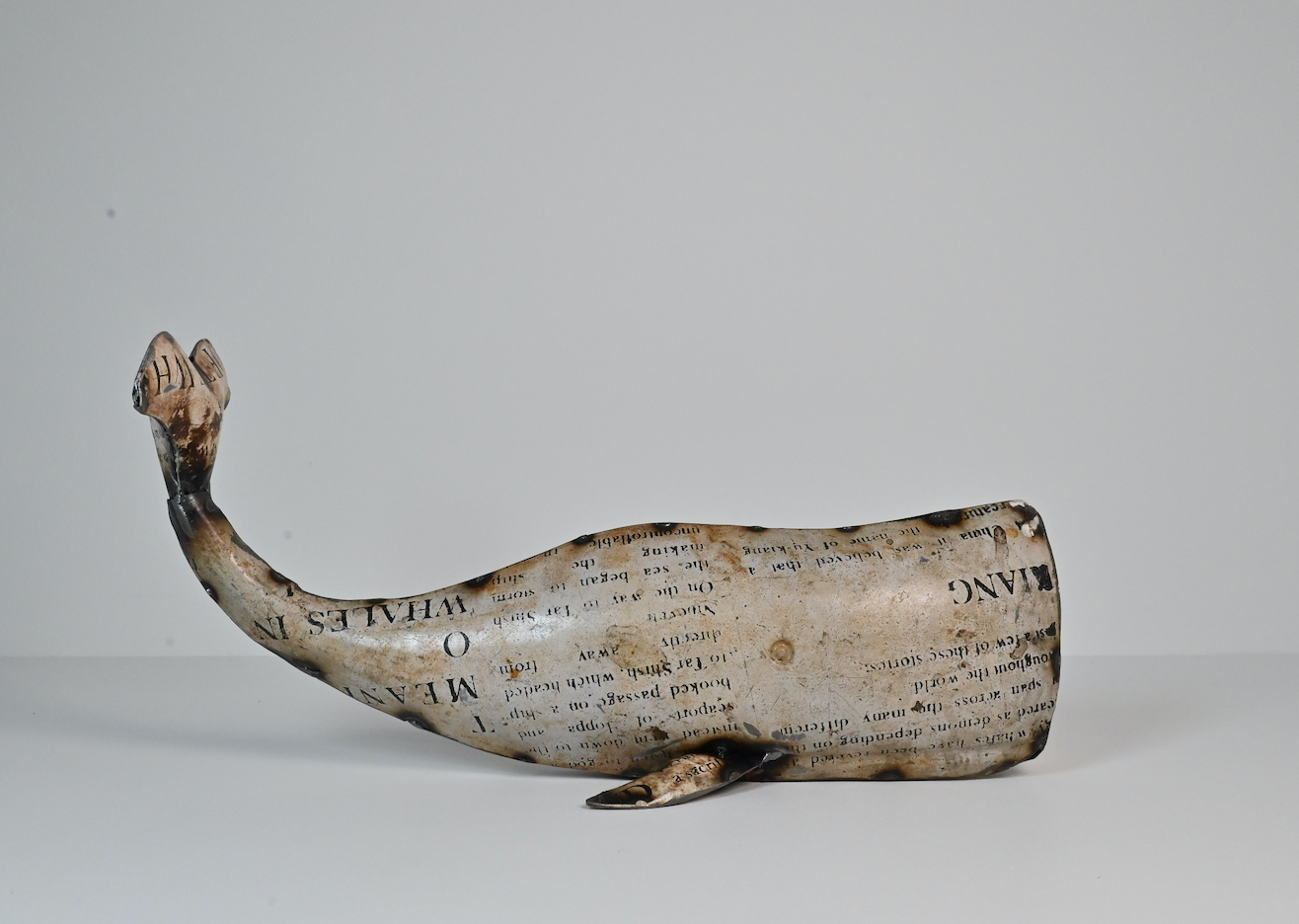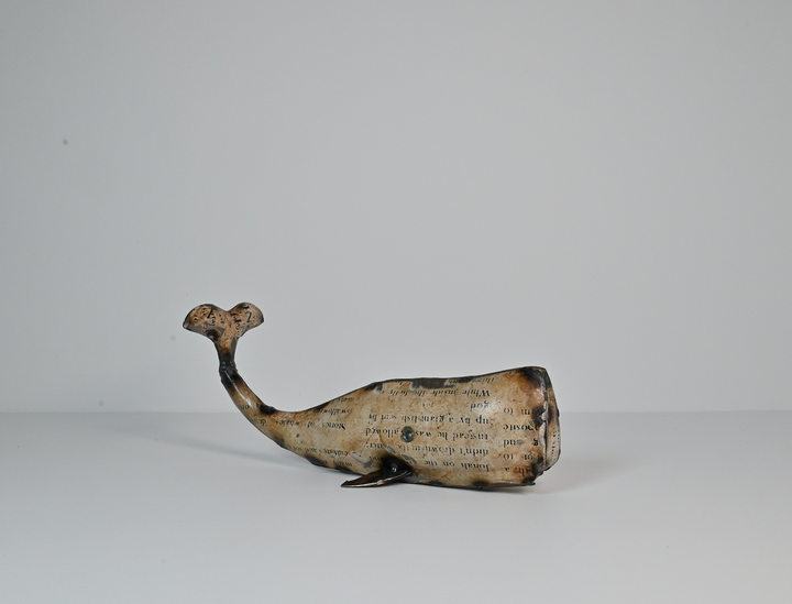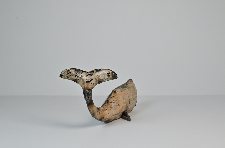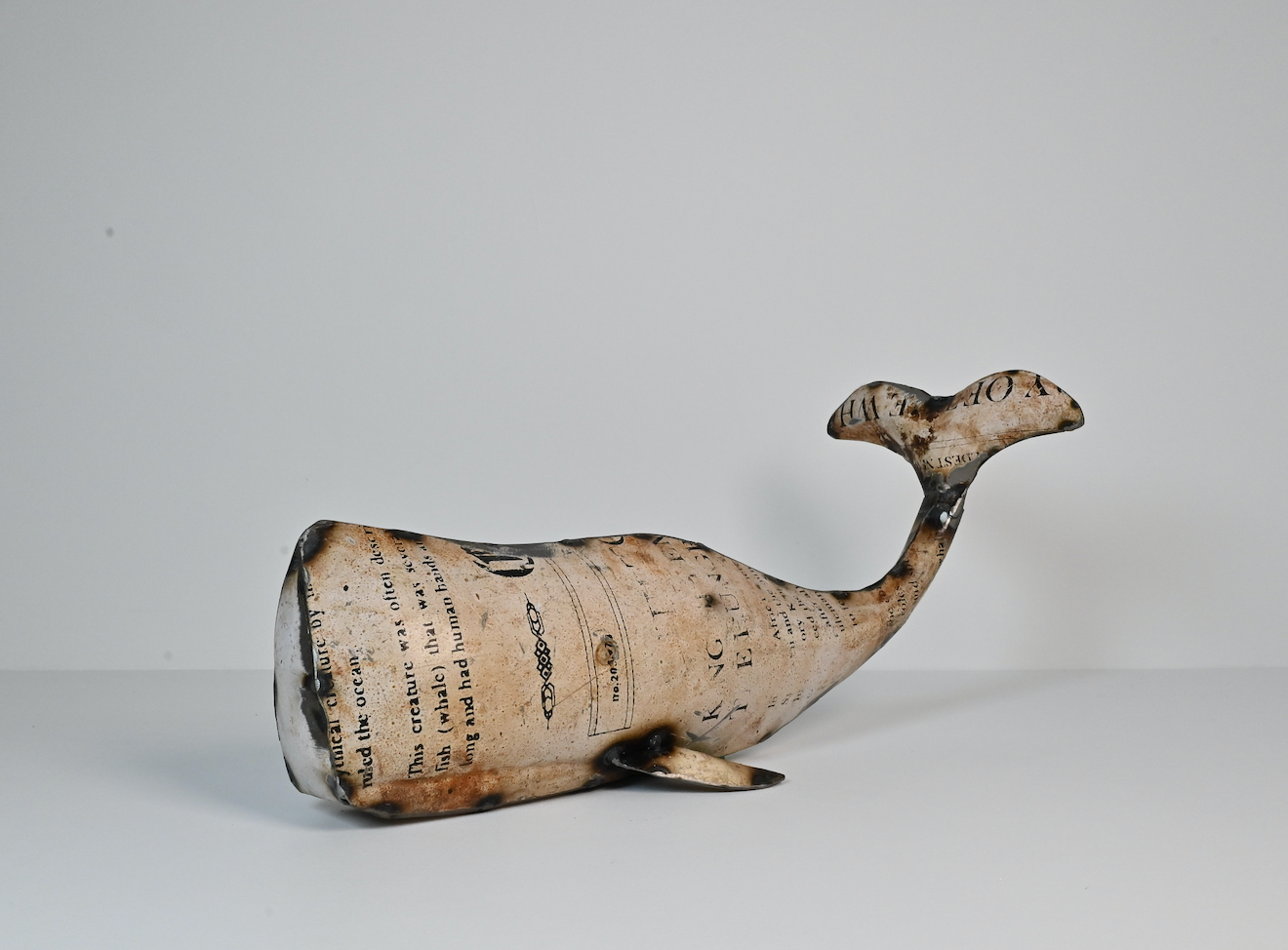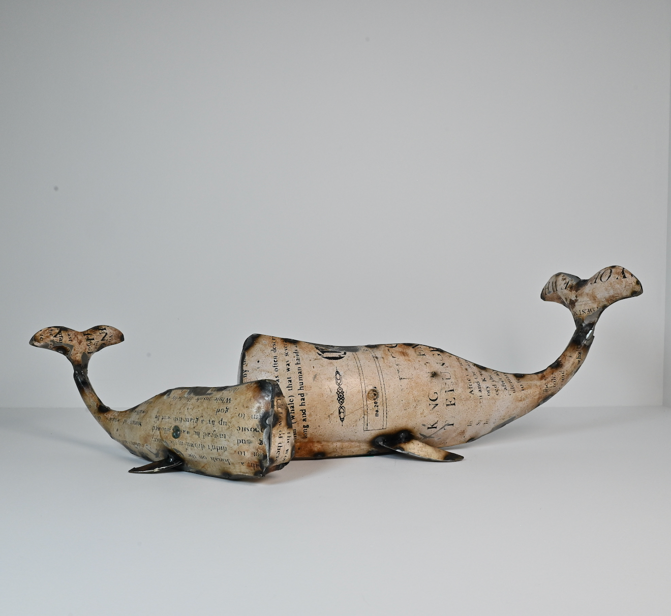 Une gracieuse baleine blanche sculptée dans du métal recyclé, aux courbes douces et aux détails complexes. Fabriquée à partir de matériaux recyclés, elle représente l'harmonie entre la durabilité et l'océan.