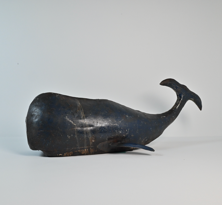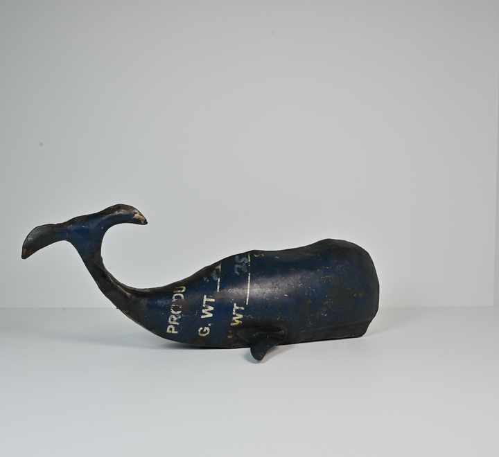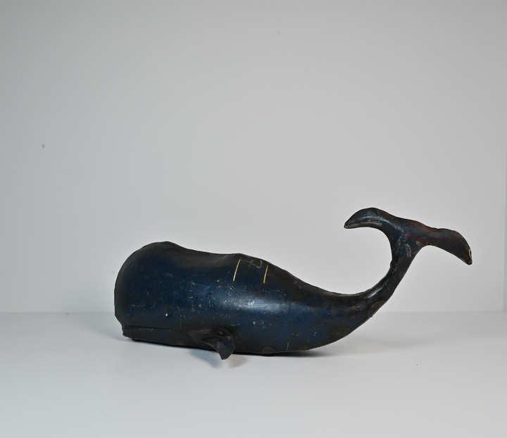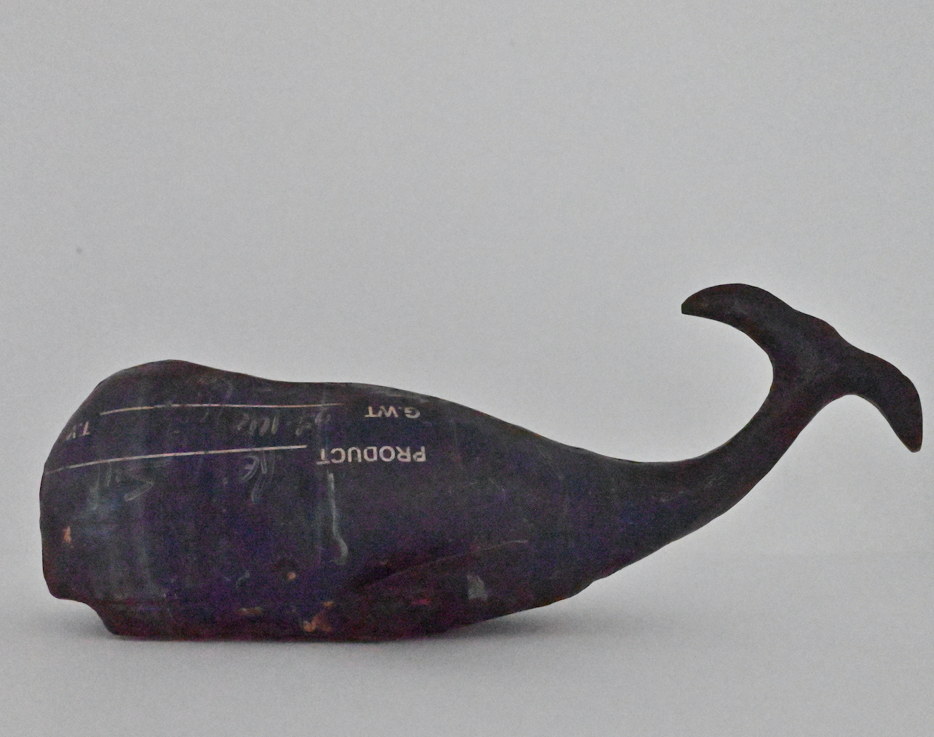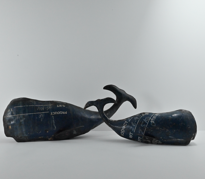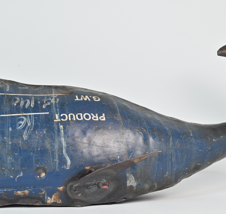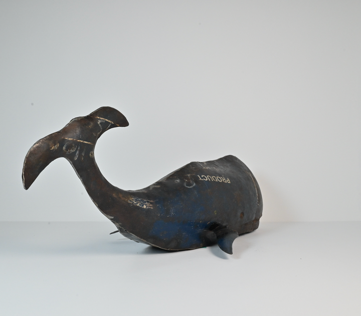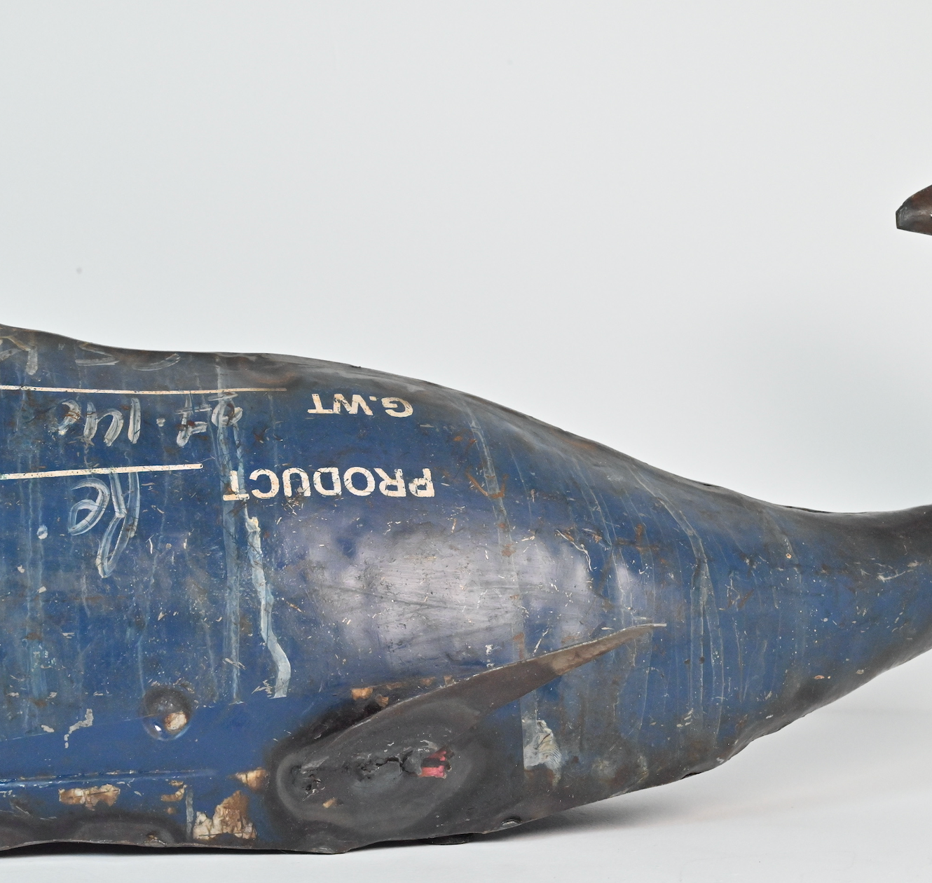 A stunning blue whale sculpture crafted from reclaimed metal, blending industrial textures with graceful curves. The unique textures and blue hues capture the essence of the ocean, merging artistry with sustainability.
