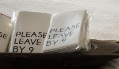 Please leave by 9 dinner napkin is a black in imprinted design on a linen like towel. Included in the package are 15 towels.