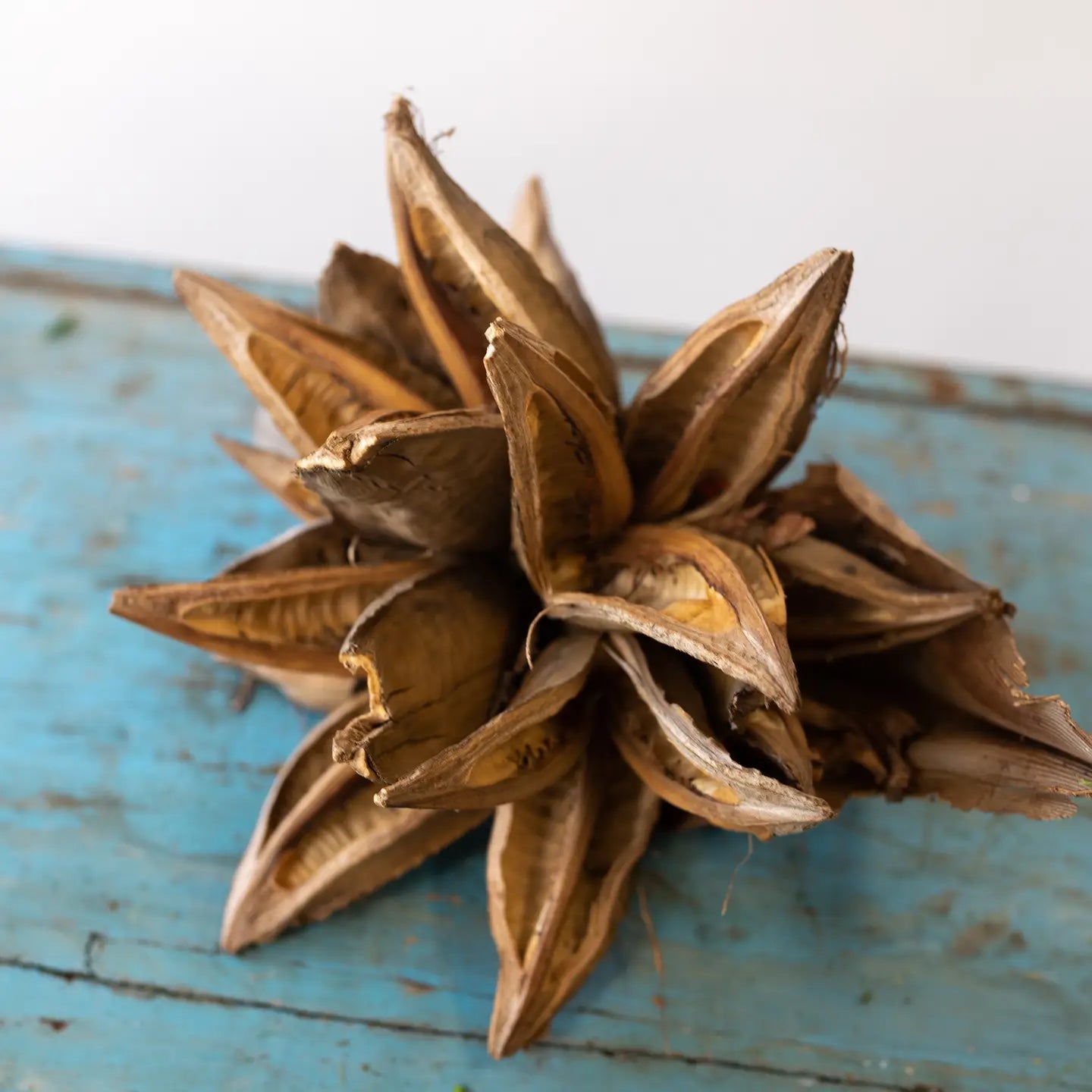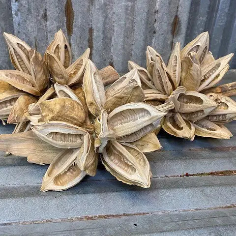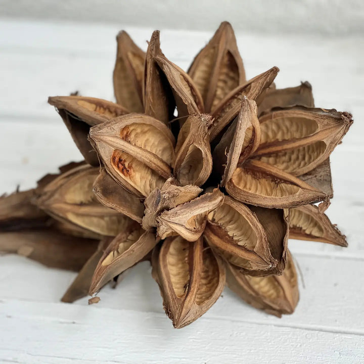 Grown and harvested in South Africa, a dried Starpod is a delicate, star-shaped seed pod with gracefully curved, pointed segments. The pod's intricate texture and organic beauty make it a captivating element in nature-inspired decor. The Starpod comes from the Amazon and grows off a palm tree. It brings a unique look and complements any look. Each Starpod is unique and no two are alike.